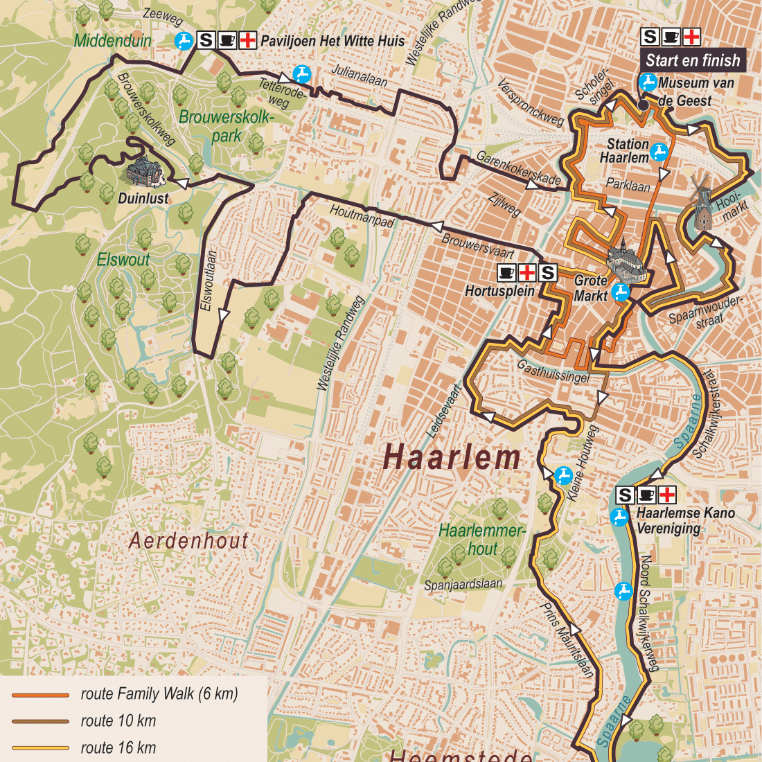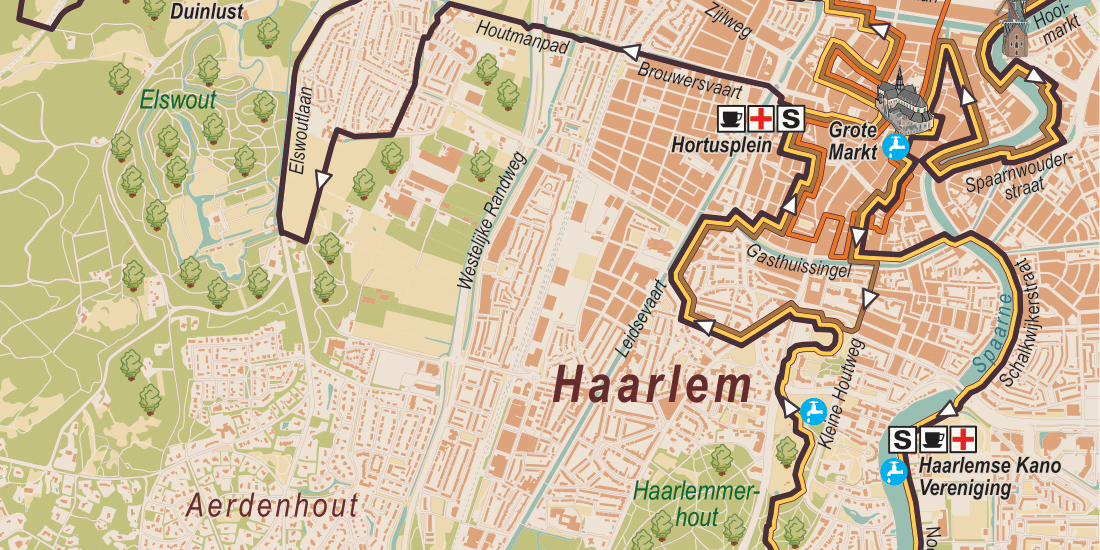 Net zoals de 10 en 16 km-wandelaars, starten de deelnemers aan de langste afstand van de KiKa Haarlem City Walk ook naast Museum van de Geest | Dolhuys. Vanaf hier volgen de 25 km-deelnemers tot net voorbij het 13 km-punt bij de verzorgingspost op het Hortusplein dezelfde route als de 16 km-wandelaars. Met de mooie kilometers langs het Spaarne en door het stadscentrum in de benen, liggen er voor de deelnemers aan 25 km liggen nog mooie kilometers door en langs buitenplaatsen in het verschiet.